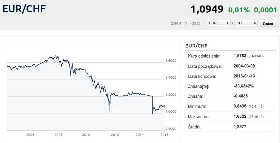 15 stycznia 2015 roku SNB ku kompletnemu zaskoczeniu rynku i przeważającej większości analityków porzucił politykę obrony minimalnego kursu wymiany euro na franka. Uwolniony z okowów kurs EUR/CHF momentalnie spadł z 1,20 do 0,97. Przez kilkanaście minut na rynku walutowym panował kompletny chaos i trudno było określić, ile w danym momencie trzeba zapłacić za franka. Po kilku dniach notowania pary euro-frank ustabilizowały się przedziale 1,05-1,10 euro za franka.