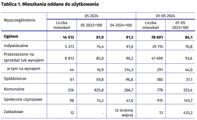 Według wstępnych danych GUS-u od stycznia do maja 2024 roku oddano do użytkowania 78 700 mieszkań, czyli 15,9% mniej niż w analogicznym okresie 2023 roku. Deweloperzy odpowiadali za 47 700 lokali mieszkalnych, czyli o 6,4% mniej niż rok temu. Prawdziwy spadek odnotowano po stronie inwestorów prywatnych, którzy oddali do użytku 29,1 tys. mieszkań, czyli aż o 29,2% mniej niż w analogicznym okresie 2023 roku. W pozostałych formach budownictwa oddano do użytkowania łącznie 1,9 tys. mieszkań (w ubiegłym roku 1,5 tys.).