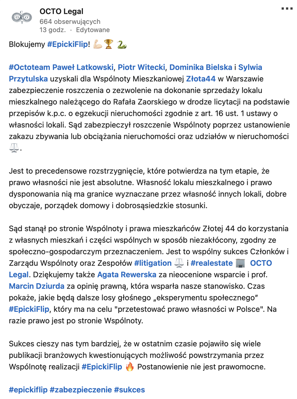 Pomiędzy rozmową Bankier.pl z mieszkańcami oraz wspólnotą mieszkaniową Złotej 44 a publikacją tego wywiadu w sprawie zdążył nastąpić zwrot. We wtorek 23 stycznia kancelaria adwokacka OCTO Legal poinformowała o zabezpieczeniu roszczenia ws. licytacji apartamentu 504. Oznacza to, że w przypadku odrzucenia odwołania Rafał Zaorski nie będzie mógł sprzedać swojego mieszkania podczas trwania postępowania.