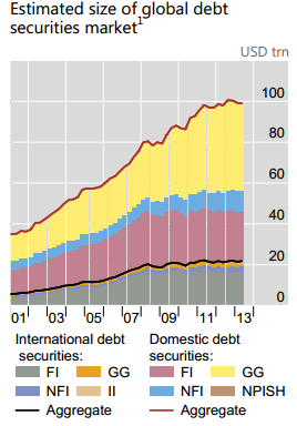 Według instytucji nazywanej czasami „bankiem centralnym banków centralnych” globalne zadłużenie wzrosło od połowy 2007 r. do połowy 2013 r. o 30 bilionów dolarów czyli o ponad 40%. Innymi słowy, w ciągu tego okresu przyrost długu był dwukrotnie wyższy od obecnego zadłużenia Stanów Zjednoczonych.