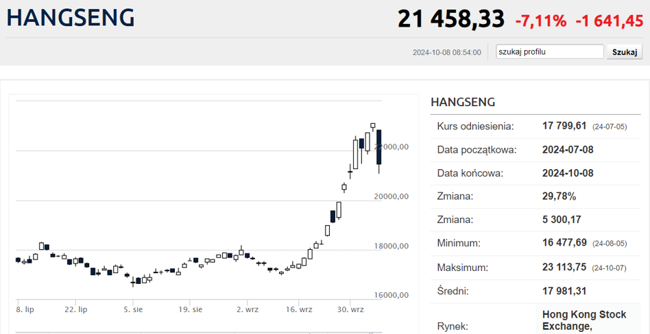 W efekcie mogliśmy obserwować "chiński rajd". Od połowy września do początku października indeks największych chińskich spółek CSI300 zyskał ponad 25%, a Hang Seng umocnił się o 30%.