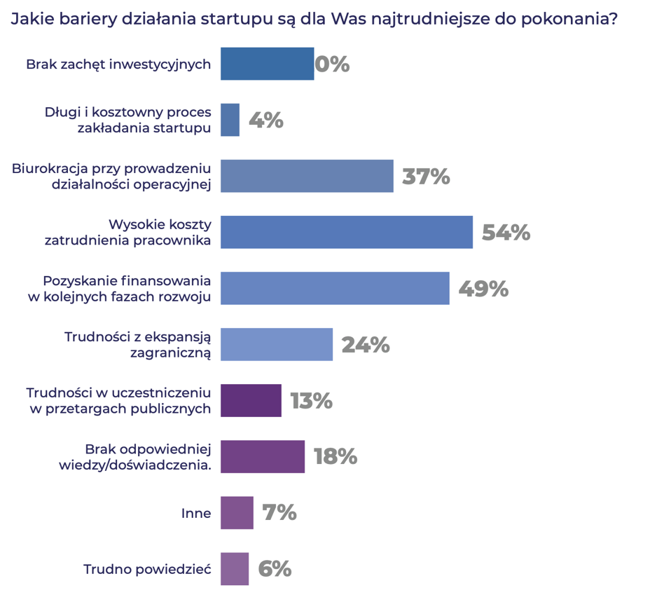Jak co roku Fundacja Startup Poland zapytała startupy o najbardziej doskwierające im kwestie w prowadzeniu działalności. Okazało się, że są to koszty zatrudnienia pracownika – na taką odpowiedź wskazuje najwięcej, bo aż 54 proc. badanych. Drugą najczęściej wymienianą barierą, sygnalizowaną przez niemal co drugi startup (49 proc.), jest problem z pozyskaniem finansowania w kolejnych fazach rozwoju.