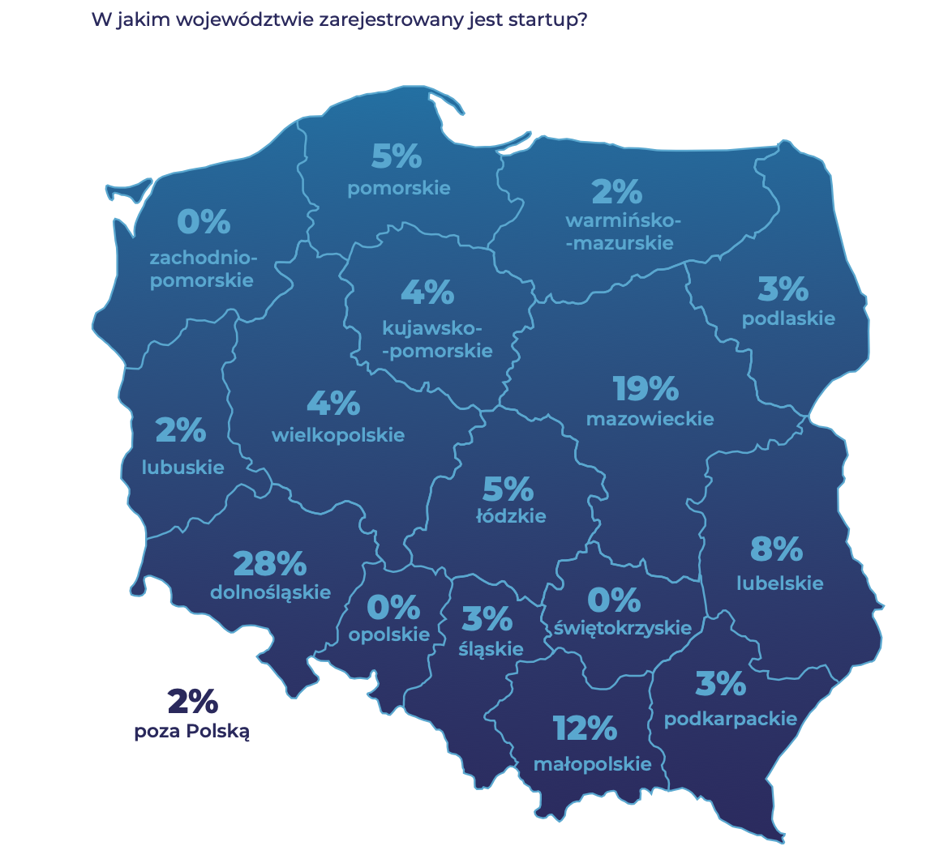 Badanie Startup Poland pokazało także, że co drugi polski startup działa na Mazowszu (50 proc.), a 46 proc. w województwie dolnośląskim. Małopolskie także tu zajmuje trzecie miejsce (30 proc. wskazań), jednak tuż za nim znalazły się województwa: wielkopolskie (27 proc.), pomorskie i łódzkie (po 25 proc.). Próg 20 proc. wskazań przekroczyły jeszcze województwa: lubelskie i kujawsko-pomorskie. Natomiast 9 proc. badanych startupów prowadzi swoją działalność poza Polską.