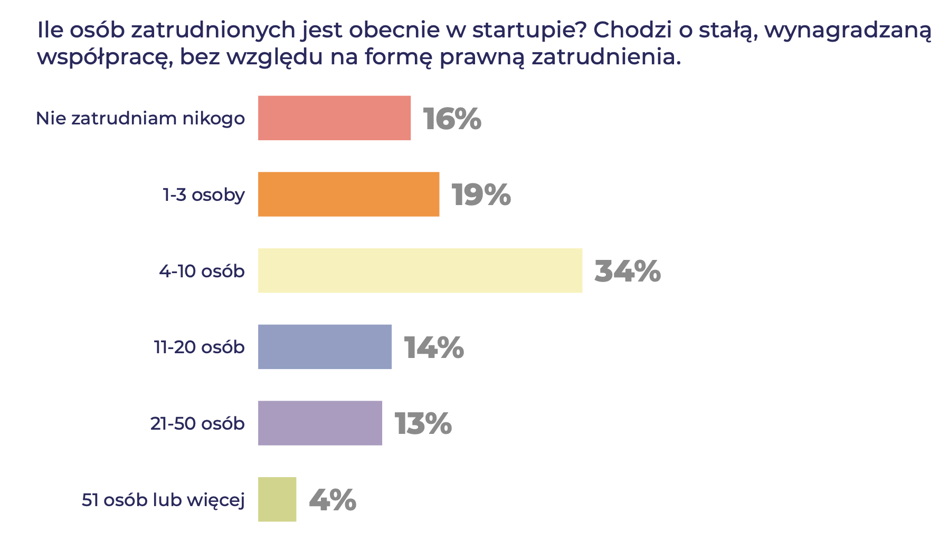 Z najnowszego badania Fundacji Startup Poland wynika, że polskie startupy tworzą raczej niewielkie, najczęściej kilku lub kilkunastoosobowe, zespoły. Więcej niż co trzeci z nich zatrudnia na stałe od 4 do 10 osób (34 proc.), a niemal co piąty maksymalnie trzy osoby. Jest także niemała grupa podmiotów, które nie zatrudniają na stałe ani jednego pracownika. To zwykle podmioty we wczesnej fazie rozwoju, finansowane z oszczędności founderów.