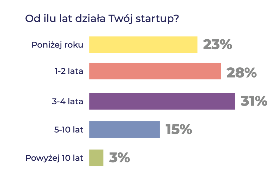 Wśród ankietowanych niemal co czwarty podmiot prowadzi działalność krócej niż rok, nieco większy odsetek (28 proc.) między rok a dwa lata, ale największą część stanowią firmy o stażu wynoszącym między 3 a 4 lata. Tych działających dłużej – powyżej 5 lat – jest 15 proc.