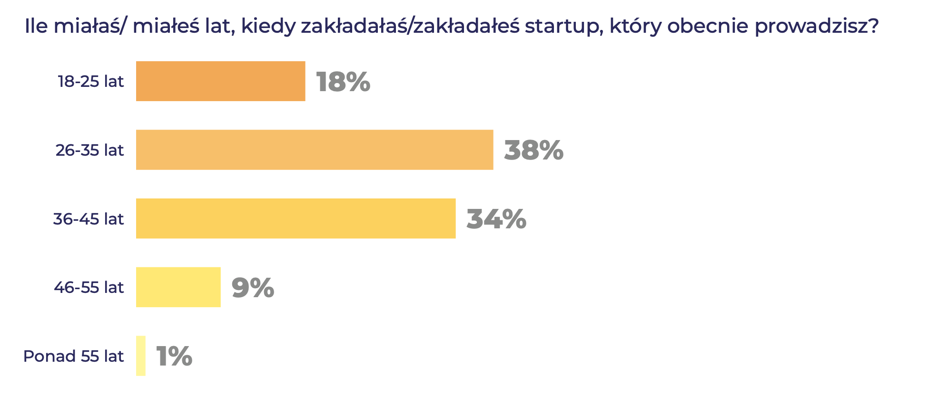 Najwięcej, bo aż 38 proc. founderów, zakładało swój startup w wieku między 26 a 35 lat, a kolejną największą grupą są founderzy w wieku 36-45 lat. Młodsza generacja (18–25 lat) to jedynie 18 proc. uczestników badania. Founderzy z pokolenia 46–55-latków są jeszcze mniej liczni – to 9 proc. pytanych. Najstarsi, powyżej 55 roku życia, to już zaledwie 1 proc. founderów. Na stworzenie startupu decydują się raczej osoby, które miały już wcześniej inne doświadczenia zawodowe.