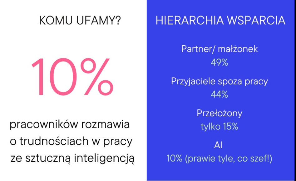 Zdaniem przedstawicieli Symetrii, rosnąca rola sztucznej inteligencji jako substytutu kontaktu z drugim człowiekiem to nie tylko technologiczna ciekawostka, ale objaw głębokiego kryzysu zaufania oraz komunikacji w polskich organizacjach. Według ich raportu pracownicy coraz częściej omijają formalne kanały wsparcia – 31 proc. wskazuje na brak skutecznych ścieżek komunikacji, a 29 proc. na brak osoby, z którą mogliby porozmawiać o sprawach prywatnych. Opracowanie pokazuje, że AI, choć nie zastąpi relacji międzyludzkich, często staje się "pierwszym krokiem" - bezpieczną próbą rozmowy, zanim pracownik zdecyduje się sięgnąć po realną pomoc. Dla wielu jest to także jedyna dostępna alternatywa - neutralna, zawsze gotowa do "wysłuchania".