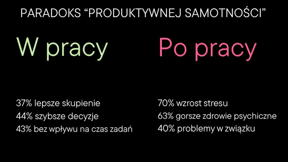 Jednak choć samotność ma wiele negatywnych konsekwencji, raport ujawnia też jej złożoną naturę. Aż 37 proc. badanych twierdzi, że samotność pomaga im w skupieniu, a 44 proc. - że pozytywnie wpływa na szybkość podejmowania decyzji. Jednak w dłuższej perspektywie izolacja ogranicza kreatywność, współpracę i zaangażowanie.