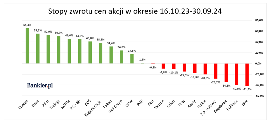 Jak się okazuje od ostatniej sesji przed zeszłorocznymi wyborami do końca września, kiedy na rynku pojawiły się już wszystkie raporty od spółek, kursy 12 wzrosły, a 10 spadły. Wśród spółek, których ceny akcji spadły najmocniej stracił kurs JSW (-41 proc.). Równie mocnej przeceny doświadczył kurs Polimeksu Mostostal (-40 proc.), a w okolicy 30 proc. spadły notowania Z.A. Puławy (-28 proc.) i L.W. Bogdanka (-34 proc.).