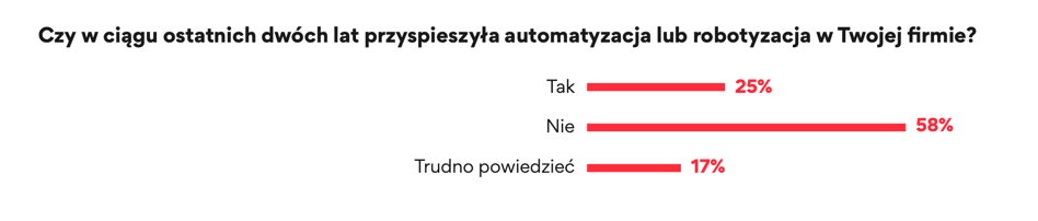Aktualnie co czwarta organizacja wdraża nowe technologie. Takie działania najczęściej deklarują największe przedsiębiorstwa (32 proc.) wobec 20 proc. średnich firm i 19 proc. małych. W niedalekiej przyszłości plany co do automatyzacji i AI ma 22 proc. przedsiębiorców. Tu szczególnie wyróżnia się branża TSL, bo aż 41 proc. firm wskazuje na konieczność wdrażania automatyzacji w najbliższym czasie. Zaraz za nią uplasował się sektor handlowy (37 proc.) i podium zamyka budownictwo (24 proc.).