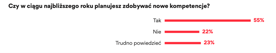 Przyspieszająca automatyzacja jest dla pracowników jednym z impulsów do zdobywania nowej wiedzy i kompetencji. Zauważają oni zmiany i planują rozwijać swoje umiejętności. W sumie 55 proc. z nich wyraża zainteresowanie poszerzaniem swojej wiedzy i umiejętności w kontekście rosnącego znaczenia automatyzacji i sztucznej inteligencji. To o 4 pkt proc. więcej niż rok temu. Natomiast 22 proc. pracowników nie ma takiego zamiaru - o 5 pkt proc. mniej niż rok temu.