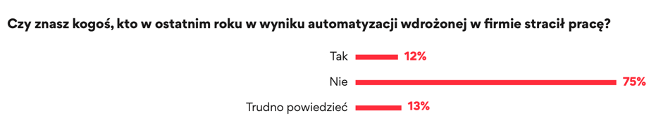 Automatyzacja ma również duży wpływ na rynek pracy. Co czwarty zatrudniony wskazuje, że w ciągu ostatnich dwóch lat przyspieszyła automatyzacja lub robotyzacja w ich firmie – to o 2 pkt proc. więcej niż w 2023 roku. Ponadto 12 proc. osób zna kogoś, kto w ciągu ostatniego roku w wyniku automatyzacji wdrożonej w firmie stracił pracę. To tyle samo co rok temu.