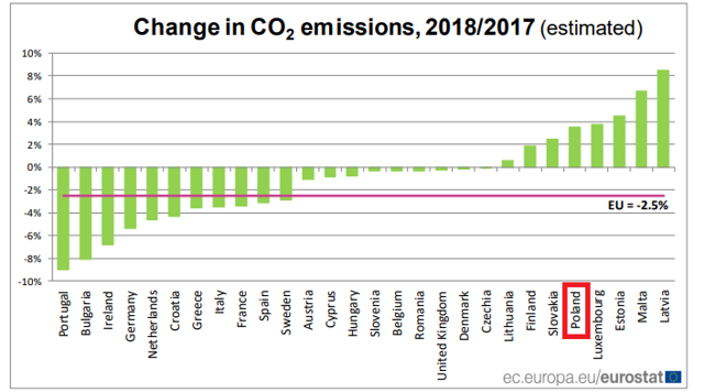 Emisje dwutlenku węgla ze spalania paliw kopalnych spadły w ubiegłym roku o 2,5 proc. w UE - podał w środę Eurostat. Nie we wszystkich państwach był jednak taki trend. Na Łotwie przyrost był największy: 8,5-proc., w Polsce odnotowano wzrost o 3,5 proc. Najwięcej CO2 nadal emitują jednak Niemcy.