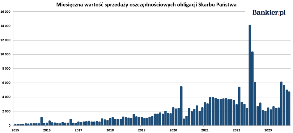 Jak do tej pory Ministerstwo Finansów sprzedało w 2023 roku obligacje za prawie 33,5 mld złotych. Ostateczny wynik za cały roku najprawdopodobniej nie zbliży się do zeszłorocznego rekordu na poziomie 49,9 mld złotych. Na tak wysoki wynik wpłynął temat obligacji zakupionych przez premiera Mateusza Morawieckiego, którym żyły media w czerwcu 2022 roku. Tego miesiąca Polacy kupili papiery oszczędnościowe za 14 mld złotych, co stanowiło najwyższą miesięczną wartość sprzedaży obligacji w historii.