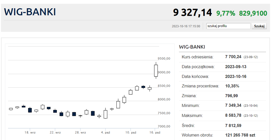 Na pierwszy plan wysuwa się sektor bankowy. WIG-Banki zyskał w poniedziałek aż 9,77 proc. i pokonał ponad roczne maksimum. Rynek zaczął wyceniać scenariusz zmiany władzy już wcześniej, bo od początku października sektor zyskał ponad 25 proc.