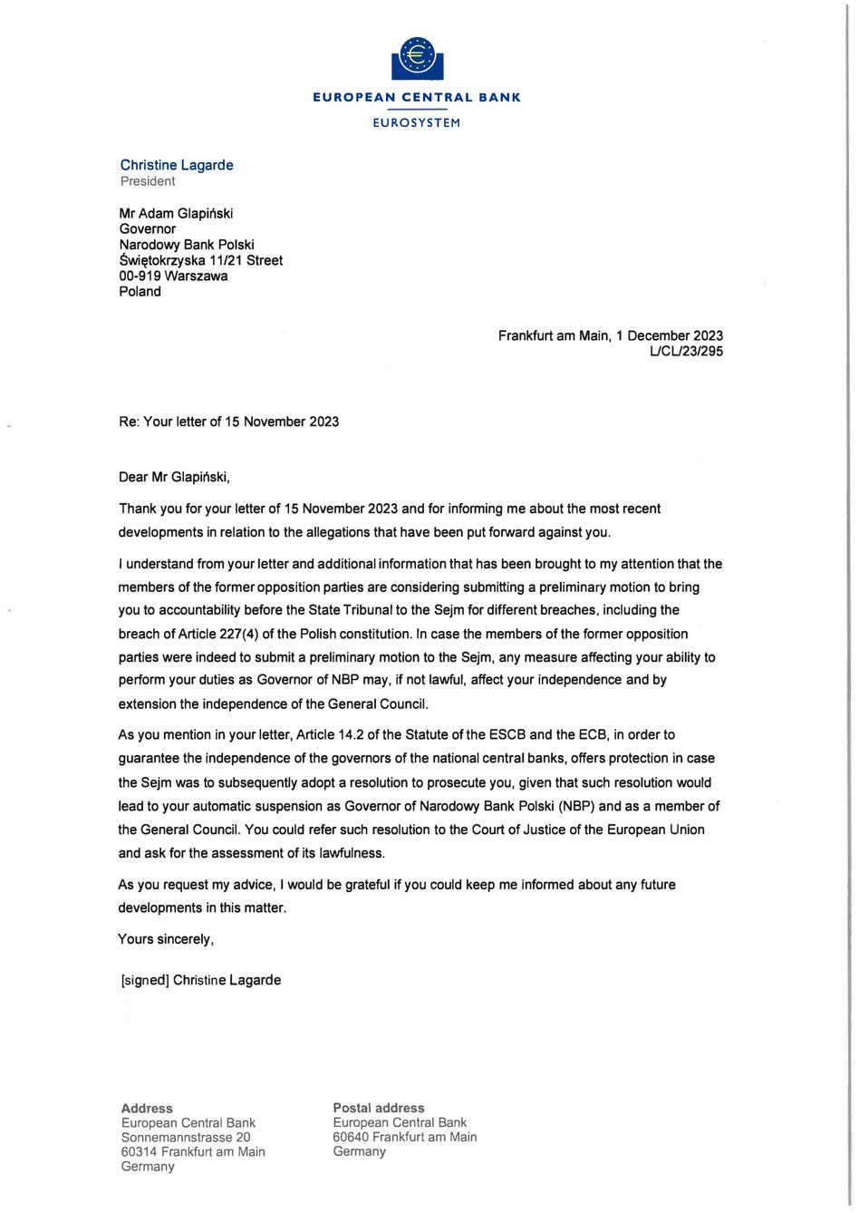 Eurpejski Bank Centralny wskazuje, że Narodowy Bank Polski będzie mógł skierować do TSUE ewentualne zawieszenie prezesa NBP ws. wniosku o postawienia prezesa NBP przed Trybunałem Stanu - wynika z listu prezeski EBC Christine Lagarde do prezesa NBP Adama Glapińskiego.