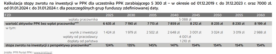 Na rachunku uczestnika PPK, oszczędzającego w PPK od grudnia 2019 r. (zarabiającego do końca 2023 r. 5 300 zł i od 2024 r. 7 000 zł), w zależności od grupy FZD, znajduje się średnio od 6 635 zł do 8 235 zł więcej, niż on sam wpłacił do PPK. To oznacza dla uczestnika PPK od 124 proc. do 154 proc. zysku. Jest to wartość aktywów PPK bez wpłat pracownika podzielona przez wpłaty do PPK od pracownika w wysokości 2 proc.