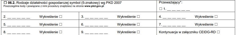 - Przeważająca działalność gospodarcza — tutaj umieszcza się kod, który jest zbieżny z podstawowym profilem działalności danego przedsiębiorstwa. Zawsze podaje się jeden przeważający kod.