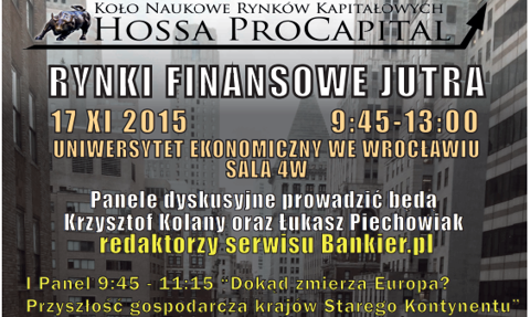 2015-11-14 09:14Dziesięciu gości i dwa panele dyskusyjne prowadzone przez analityków Bankier.plKoło Naukowe Rynków Kapitałowych Hossa ProCapital, działające przy Uniwersytecie Ekonomicznym we Wrocławiu, zaprasza na organizowaną przez siebie konferencję "Rynki finansowe jutra", otwierającą rok akademicki 2015/2016!