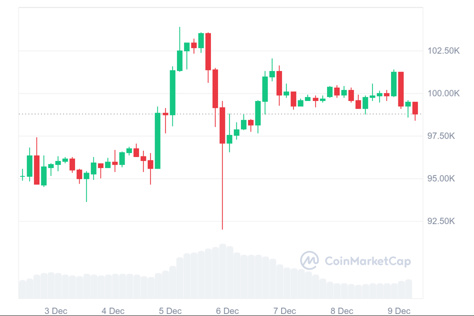 Wpływy do giełdowych funduszy, skupujących bitcoiny z rynku, mają bardzo istotny wpływ na kurs bitcoina, który 5 grudnia przekroczył po raz pierwszy w historii poziom 100 tys. dol. Krótko po nowym rekordzie nastąpił flash crash. W ciągu kilkunastu minut kryptowaluta odnotowała spadek o prawie 10 tys. dol. i przetestowała poziom 90 tys. dol. W kolejnych dniach notowania bitcoina wróciły do okolic 100 tys. dol.