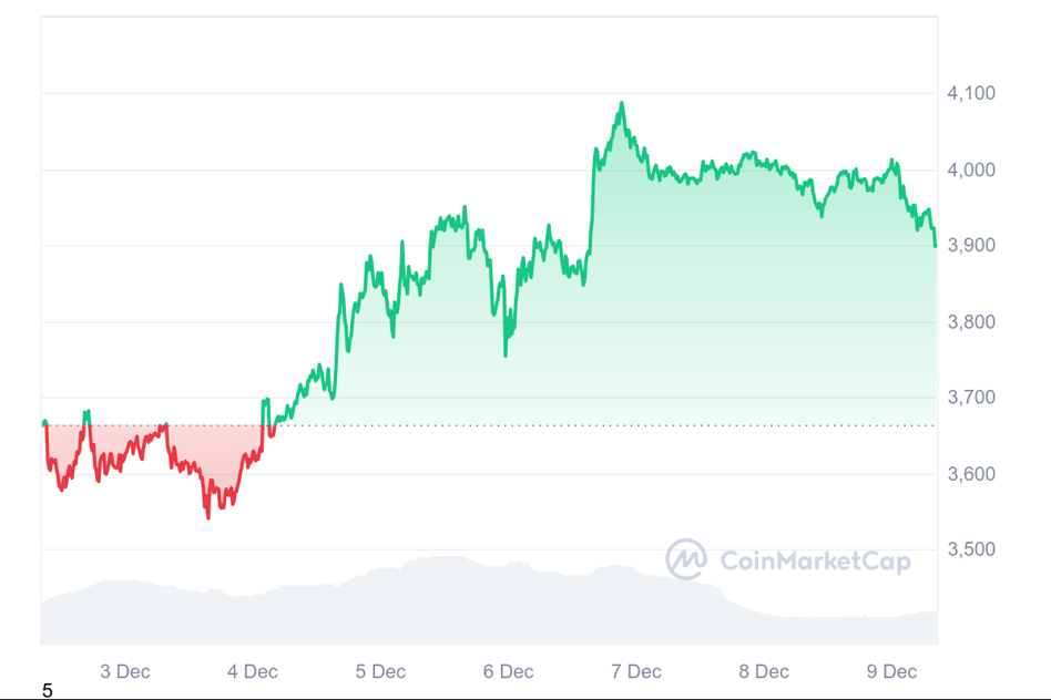 Rosnące zainteresowanie ETF-ami na drugą największą kryptowalutę przekłada się na jej kurs, który w ostatnich dniach znajdował się powyżej 4000 dol. W poniedziałek 9 grudnia ethereum odnotowało jednak korektę, spadając poniżej 3900 dol.