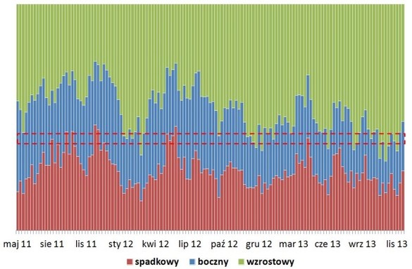Giełdzie sprzyjała Rada Polityki Pieniężnej, która obniżyła stopy procentowe do rekordowo niskich 2,5%. Gwałtowny spadek oprocentowania depozytów wywołał napływ pieniędzy na rynek akcji za pośrednictwem funduszy inwestycyjnych. Tylko do końca września do funduszy polskich akcji napłynęło 4,9 mld zł, z czego ponad połowa w okresie od września do listopada. Niska inflacja i kiełkujące ożywienie w polskiej gospodarce sprzyjało wzrostom cen akcji, zgodnie z teorią cyklu inwestycyjnego. W pierwszym kwartale dynamika polskiego PKB osiągnęła cykliczne minimum i zapewne będzie rosnąć przynajmniej do połowy 2014 roku. Poprawa koniunktury gospodarczej i napływ gotówki do TFI w mojej ocenie powinny podtrzymać trend wzrostowy przez pierwsze miesiące 2014 roku.