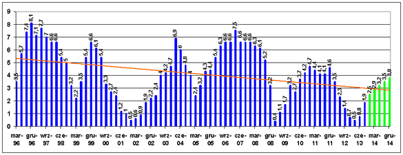 Dynamika PKB Polski (rdr w proc.). Na zielono zaznaczono prognozy. Średni czas trwania ożywienia gospodarczego wynosi 6,75 kwartałów