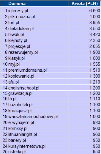 Adres rezerwujemy.pl został sprzedany za 1 900 zł. Nowy właściciel domeny klasyk.pl zapłacił za adres 1 600 zł. Domena kopiowanie.pl znalazła kupca za kwotę 1 300 zł. W czerwcu właściciela zmieniła także domena bazahoteli.pl. Nabywca zapłacił za nią 1 100 zł, ale do tej pory adres kieruje na stronę z linkami reklamowymi.