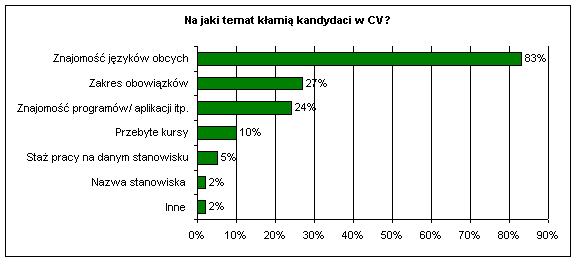 Na podstawie analizy aplikacji na stanowiska specjalistyczne i menedżerskie przeprowadzonej przez międzynarodową firmę rekrutacyjną Antal International wynika, iż prawie jedna trzecia badanych podaje nieprawdziwe informacje w swoich CV. Najwięcej z nich, bo aż 83% kłamie na temat znajomości języków obcych i zakresu obowiązków (27%). Inne nieścisłości to podawanie błędnych informacji na temat znajomości wymaganych programów i aplikacji (na przykład takich jak Lean Manufacturing, 5S, Kaizen, Kanban,Pareto itp. w procesach rekrutacyjnych w produkcji), przebytych kursów, stażu pracy (maskowanie luk i podawanie złych dat) czy nazw stanowisk. Wśród wymienionych znalazły się także brak informacji na temat urlopów bezpłatnych i wychowawczych (jednocześnie wliczone do ogólnej liczby lat doświadczenia) czy stopień samodzielności na stanowisku.