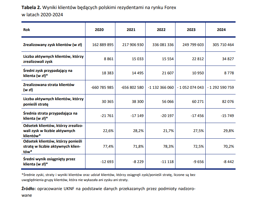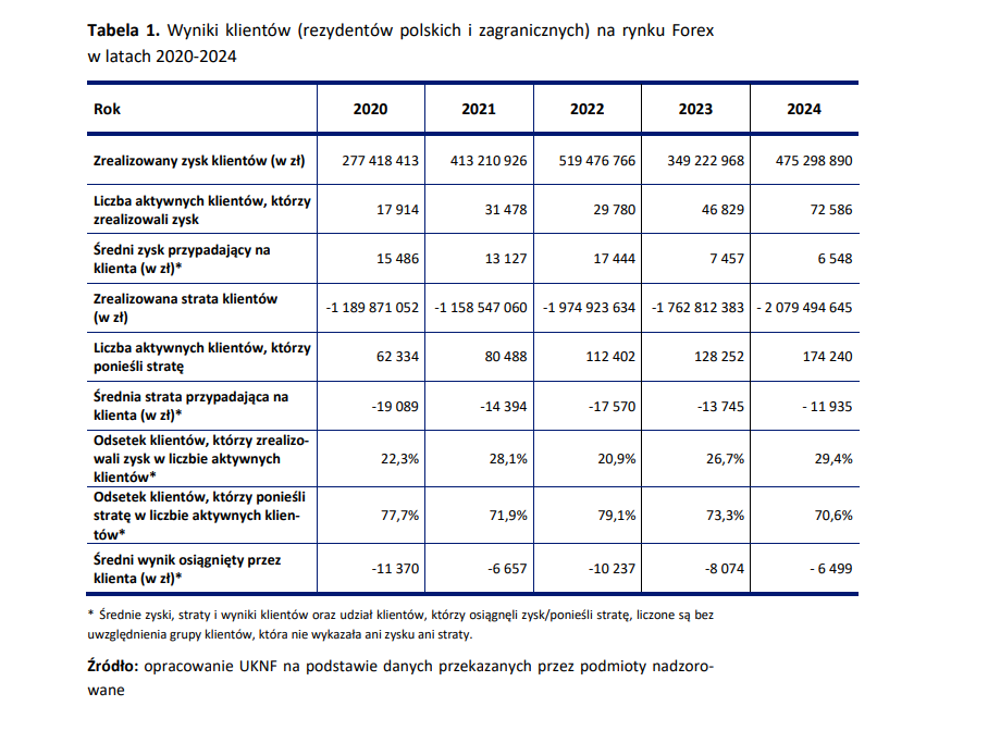 Łączna zrealizowana strata klientów forex w ub. roku wyniosła 2,08 mld zł wobec 1,76 mld zł w 2023 r. Natomiast łączny zrealizowany zysk wyniósł 475,3 mln zł. Był więc ponad 4,3 razy mniejszy od zaksięgowanych strat. Liczba aktywnych klientów, którzy ponieśli stratę, wzrosła do 174,2 tys. ze 128,3 tys. Liczba aktywnych klientów, którzy zrealizowali zysk wzrosła z ponad 46,8 tys. do blisko 72,6 tys.