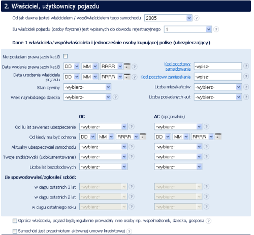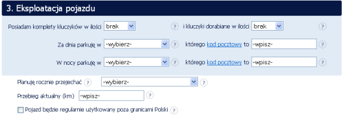 Podczas wypełniania formularzy dostępnych na stronie porównywarek zdziwić mogą niektóre szczegółowe pytania dotyczące twojej osoby jako właściciela (szczególnie o stan cywilny, liczbę dzieci i wiek najmłodszego dziecka) lub sposobu użytkowania pojazdu – może na przykład pojawić się prośba o podanie kodu pocztowego miejsca, w którym parkujesz lub pytanie o to, ile kompletów kluczyków posiadasz. Nie bój się podać tego typu informacji, wpływają one bowiem na bardziej wiarygodne określenie zwyżek lub zniżek, które będziesz mógł uzyskać, a tym samym na znalezienie najlepszej dla ciebie oferty.