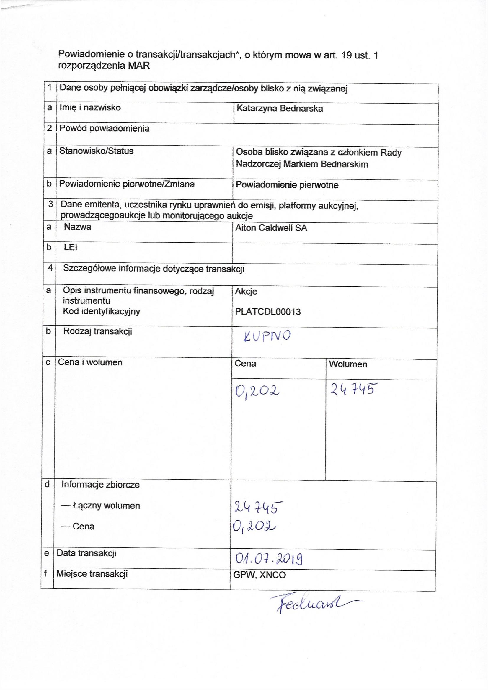 | Zarząd Aiton Caldwell S.A. („Emitent”) w wykonaniu obowiązku wynikającego art. 19 ust. 3 Rozporządzenia Parlamentu Europejskiego i Rady (UE) nr 596/2014 z dnia 16 kwietnia 2014r. w sprawie nadużyć na rynku oraz uchylające dyrektywę 2003/6/WE Parlamentu Europejskiego i Rady i dyrektywy Komisji 2003/124/WE, 2003/125/WE i 2004/72/WE („Rozporządzenie MAR”) informuje, iż w dniu 2 lipca 2019 r. o godz.: 12:51 wpłynęło do Spółki od Pani Katarzyny Bednarskiej zawiadomienie (powiadomienie pierwotne) złożone na podstawie art. 19 ust. 1 Rozporządzenia MAR o dokonaniu transakcji kupna akcji Aiton Caldwell S.A. Z treści w/w pisma wynika, iż w dniu 1 lipca 2019 r. Pani Katarzyna Bednarska – osoba blisko związana z członkiem Rady Nadzorczej Emitenta Markiem Bednarskim dokonała transakcji kupna akcji Aiton Caldwell S.A. (kod identyfikacyjny: PLATCDL00013). Poniżej Emitent podaje szczegółowe informacje dotyczące transakcji przekazane przez Panią Katarzynę Bednarską: 1. Opis instrumentu finansowego, rodzaj instrumentu: Akcje. 2. Kod identyfikacyjny: PLATCDL00013. 3. Rodzaj transakcji: kupno 4. Cena i wolumen: CENA WOLUMEN 0,202 zł 24.745 5. Informacje zbiorcze: łączny wolumen: 24.745 cena: 0,202 zł 6. Data transakcji: 1.07.2019 r. 7. Miejsce transakcji: GPW, XNCO. W załączeniu przedstawiamy skan otrzymanego powiadomienia. |