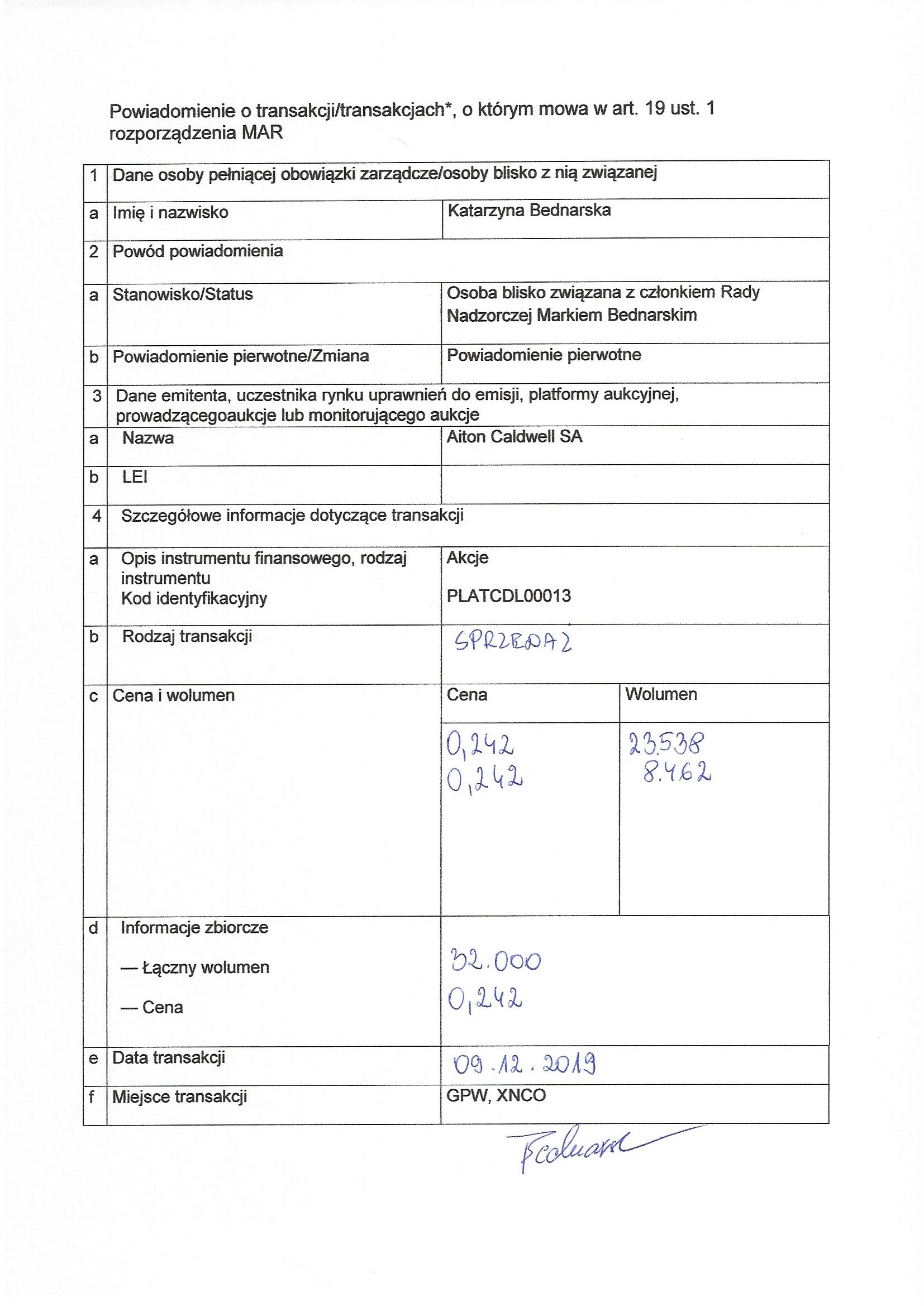 | Zarząd Aiton Caldwell S.A. („Emitent”) w wykonaniu obowiązku wynikającego art. 19 ust. 3 Rozporządzenia Parlamentu Europejskiego i Rady (UE) nr 596/2014 z dnia 16 kwietnia 2014r. w sprawie nadużyć na rynku oraz uchylające dyrektywę 2003/6/WE Parlamentu Europejskiego i Rady i dyrektywy Komisji 2003/124/WE, 2003/125/WE i 2004/72/WE („Rozporządzenie MAR”) informuje, iż w dniu 10 grudnia 2019 r. o godz.: 17:47 wpłynęło do Spółki od Pani Katarzyny Bednarskiej zawiadomienie (powiadomienie pierwotne) złożone na podstawie art. 19 ust. 1 Rozporządzenia MAR o dokonaniu transakcji sprzedaży akcji Aiton Caldwell S.A. Z treści w/w pisma wynika, iż w dniu 9 grudnia 2019 r. Pani Katarzyna Bednarska – osoba blisko związana z członkiem Rady Nadzorczej Emitenta Markiem Bednarskim dokonała transakcji sprzedaży akcji Aiton Caldwell S.A. (kod identyfikacyjny: PLATCDL00013). Poniżej Emitent podaje szczegółowe informacje dotyczące transakcji przekazane przez Panią Katarzynę Bednarską: 1. Opis instrumentu finansowego, rodzaj instrumentu: Akcje. 2. Kod identyfikacyjny: PLATCDL00013. 3. Rodzaj transakcji: sprzedaż 4. Cena i wolumen: CENA WOLUMEN 0,242 zł 23.538 0,242 zł 8.462 5. Informacje zbiorcze: łączny wolumen: 32.000 cena: 0,242 zł 6. Data transakcji: 9.12.2019 r. 7. Miejsce transakcji: GPW, XNCO. W załączeniu przedstawiamy skan otrzymanego powiadomienia. |
