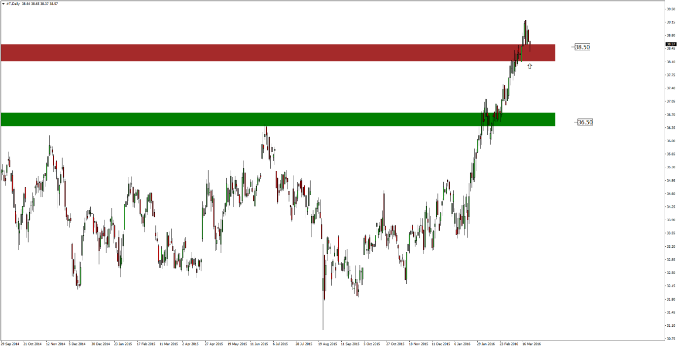 Spółka AT&T od początku roku urosła już ponad 16,5%, a w minionym tygodniu został przełamany silny poziom oporu 38,50 USD, który obecnie powinien pełnić rolę wsparcia. Ponadto wczoraj na wykresie dziennym pojawiła się formacja pin bar, która może świadczyć o kończącej się korekcie spadkowej i powrocie do trendu wzrostowego. Przebicie wspomnianego obszaru 38,50 USD otwiera drogę do strefy 43 USD, czyli szczytów z początku 2008 roku. Nawet po osiągnięciu tego pułapu akcje będę wciąż daleko od swoich historycznych maksimów, które wypadają w pobliżu 60 USD i zostały ustanowione podczas banki internetowej na początku milenium.