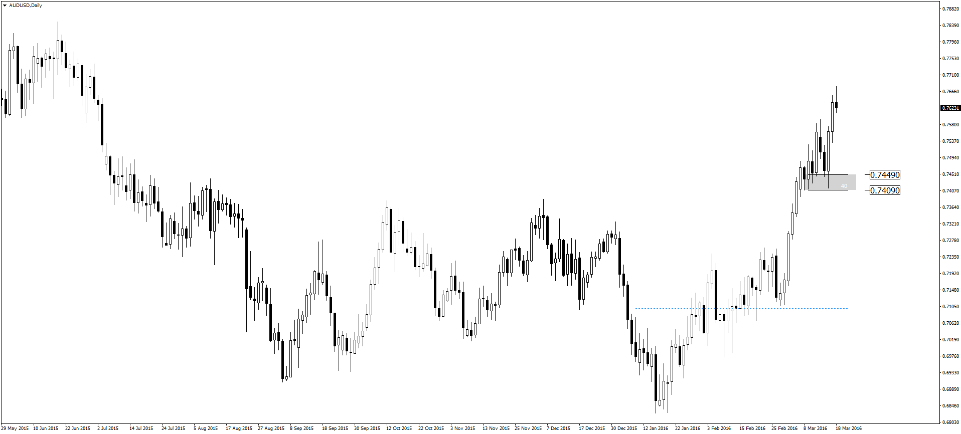 Dzisiejszego dnia na wykresie dziennym mamy wyrysowaną czarną świeczkę, jest to spowodowane zamykaniem transakcji długich. Jeżeli do głosu dojdzie strona podażowa to korekta będzie mogła dojść nawet do strefy 0,740-0,744.