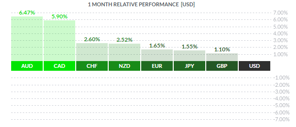 Przewaga byków na rynku surowców jest doskonale widoczna. Ceną za baryłkę ropy WTI w bieżącym tygodniu wynosi 42$. Kontrakty terminowe na miedź w bieżącym tygodniu urosły ponad 6%, cena żelaza od początku roku wzrosła ponad 20%. Wszystkie te czynniki wspierają pary surowcowe, które w tym miesiącu mocno zyskują. Najsilniejszą walutą względem dolara amerykańskiego jest niewątpliwie dolar australijski, który zanotował ponad 6% wzrosty.