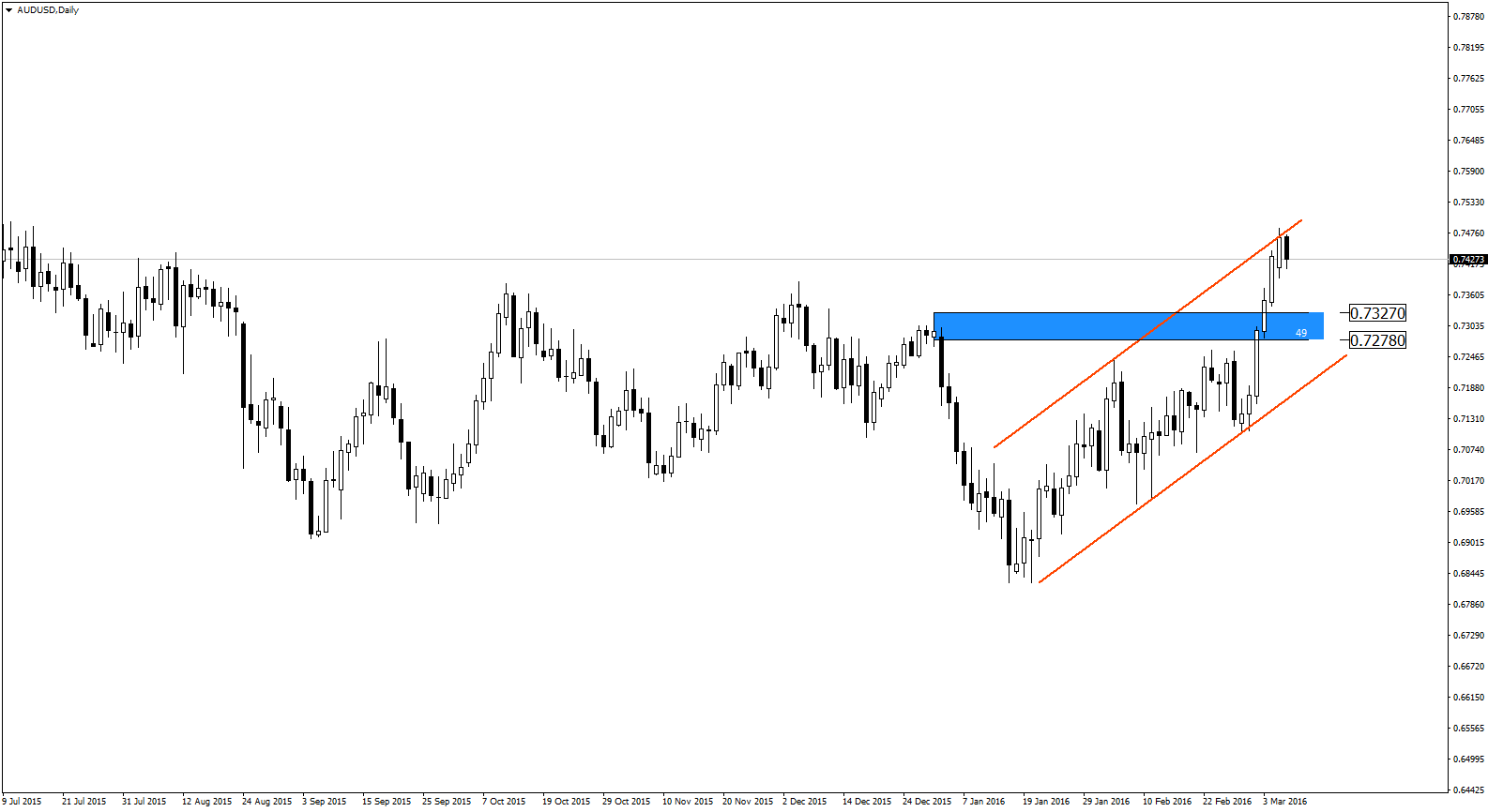 Drugi tydzień marca przynosi dalsze umacnianie się dolara australijskiego na szerokim rynku. Wszystko za sprawą rajdu na surowcach mineralnych, szczególnie miedzi oraz rud żelaza. Ruda żelaza odnotowała najwyższy jednodniowy wzrost w historii swoich notowań, jednodniowy wzrost wynosił bowiem 20%. Byczy sentyment na rynku surowców przemawia za kontynuacją umacniania się dolara australijskiego oraz innych par surowcowych względem dolara amerykańskiego.