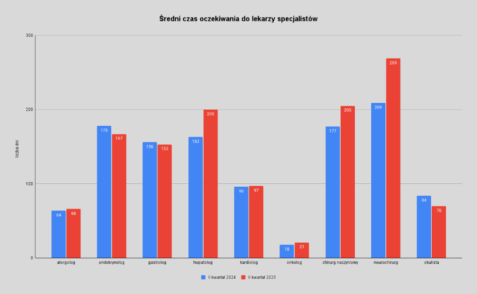 Jak co kwartał Narodowy Fundusz Zdrowia publikuje sprawozdanie ze swojej działalności, w którym prezentuje średni czas oczekiwania na realizację świadczeń medycznych. W porównaniu do II kwartału 2024 r. sytuacja w poradniach specjalistycznych wciąż nie wygląda zachęcająco (choć warto pamiętać, że są to dane zbiorcze i w poszczególnych województwach statystyki mogą być inne). Na wizytę do gastrologa czy endokrynologa czekamy nieco krócej niż rok temu, ale czas wciąż wynosi parę miesięcy, a nie kilka czy kilkanaście dni. Jeszcze gorzej wygląda to w takich specjalizacjach jak hepatologia, chirurgia naczyniowa czy neurochirurgia, gdzie na konsultację trzeba czekać średnio ponad 200 dni.