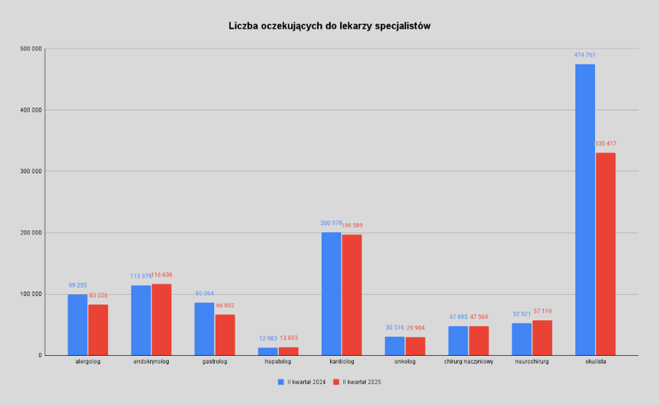 Po pierwszym półroczu 2025 r. liczba osób oczekujących na wizyty rok do roku uległa zmniejszeniu, co widać np. w przypadku poradni alergologicznych czy gastroenterologicznych. Podobna tendencja jest przy wizytach u kardiologa i okulisty, tu jednak zwraca uwagę wciąż wysoka liczba pacjentów na listach oczekujących.