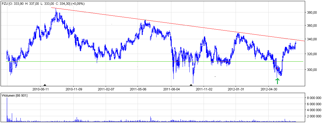Obecnie giełdowa wycena PZU zbliżyła się do poziomu wyznaczonego przez szczyty notowań akcji, gdzie każdy następny znajdował się niżej od poprzedniego. Przekroczenie tego poziomu (zaznaczonego czerwoną linią na wykresie poniżej) będzie dla PZU ciekawym wyzwaniem, zwłaszcza w perspektywie zbliżającej się dywidendy (która prędzej czy później znajdzie się w cenie spółki).