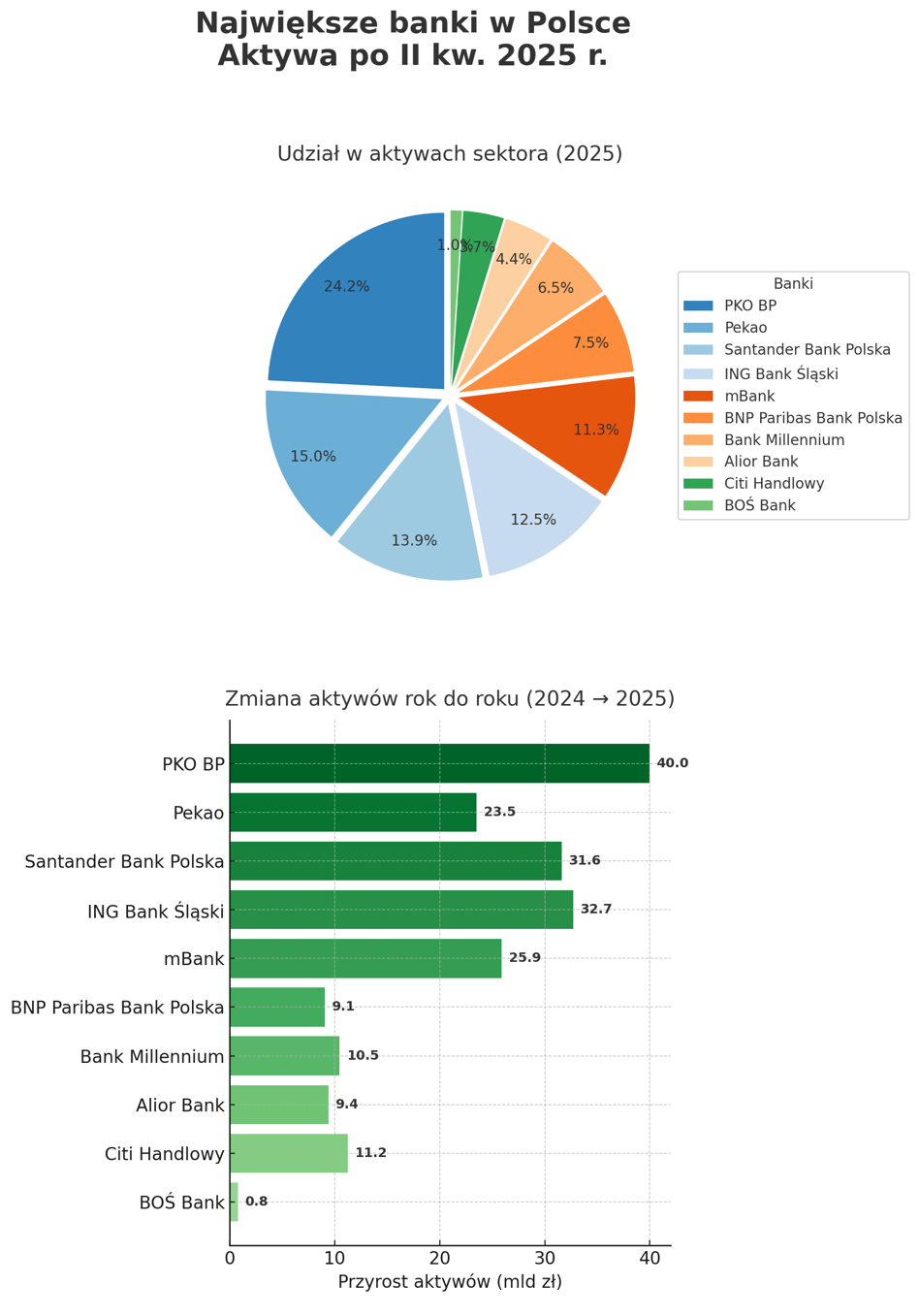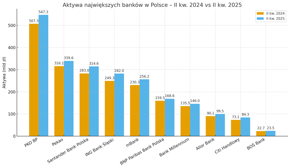 Największym bankiem w Polsce pozostaje PKO Bank Polski. Jego aktywa – czyli całość zasobów, od udzielonych kredytów po inwestycje i posiadane środki pieniężne – przekroczyły 547 miliardów złotych. W ciągu roku bank powiększył swój bilans o około 40 miliardów złotych. Tuż za PKO plasuje się Bank Pekao - jego aktywa wynoszą niemal 340 miliardów złotych, czyli o 23,5 miliarda więcej niż rok wcześniej.