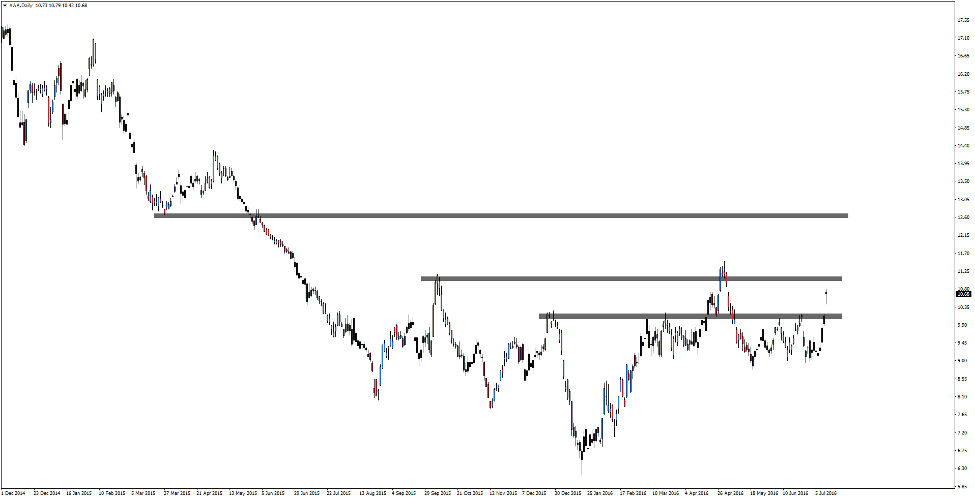 Akcje spółki Alcoa jednego z największych producentów aluminium otworzyły się wczoraj luką wzrostową przełamując poziom oporu w okolicach 10 USD. Obecnie najbliższym poziomem oporu jest strefa w pobliżu 11 USD, której przełamanie otworzy drogę do szczytu z czerwca 2015 roku w okolicy 12,50 USD.