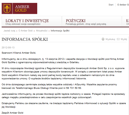 (...) W dniu dzisiejszym, tj. 13 sierpnia 2012 r. zapadła decyzja o likwidacji spółki pod firmą Amber Gold Spółka z ograniczoną odpowiedzialnością z siedzibą w Gdańsku.