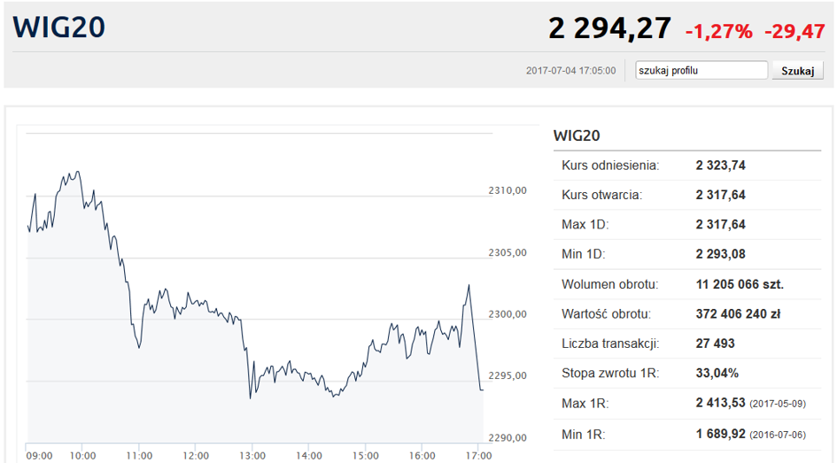 | WIG 20 | Polska | 2294,27 | -1,27 | -2,17 | -0,39 | 33,04 | 17,78 |