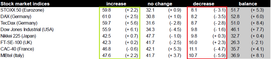 Pomimo dość ostrożnego podejścia do otoczenia gospodarczego, nie słabną oczekiwania dotyczące wzrostów na głównych dojrzałych rynkach akcji. Ponad połowa ankietowanych analityków zakłada zwyżki DAX-a, Stoxx50 i Dow Jonesa w perspektywie najbliższych sześciu miesięcy. Frakcja „byków” przekracza 40% w przypadku brytyjskiego FTSE100, francuskiego CAC40 i włoskiego MIBtel. Poza FTSE100 w żadnym innym przypadku odsetek „niedźwiedzi” nie przekracza 11,1%.
