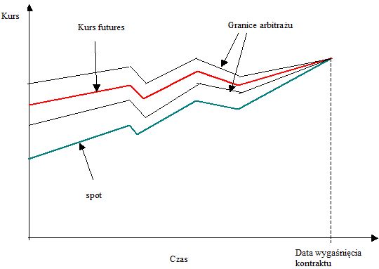 Bardziej skomplikowaną odmianą omawianej strategii jest arbitraż między rynkiem terminowym futures oraz rynkiem transakcji gotówkowych.Aby zaistniały warunki dla przeprowadzenia arbitrażu kurs kontraktu terminowego musi się odchylać od wartości teoretycznej. Jeżeli wartości teoretyczne zostaną określone dla ceny bid oraz ask otrzymamy dwa wykresy tworzące kanał zeroarbitrażowy. Jeżeli wykres kursu kontraktu znajduje się wewnątrz kanału, wówczas arbitraż nie jest opłacalny. Na wykresie 1 poniżej przedstawiono przykład zależności cen w okresie trwania kontraktu na rynku spot oraz terminowym oraz możliwości arbitrażu.