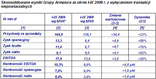 Po III kwartałach 2009 r. skonsolidowane przychody Grupy Armatura wzrosły do poziomu 169,5 mln zł tj. o 22% w porównaniu do analogicznego okresu w 2008 r. Bez uwzględnienia jednostkowych transakcji niepowtarzalnych, Grupa wypracowała zysk operacyjny na poziomie 13,3 mln zł, a zysk netto 9,1 mln zł, co oznacza odpowiednio wzrost o 58% i 82% w stosunku do wyników po III kwartałach 2008 r.