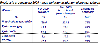 * Po wyłączeniu zdarzeń jednostkowych osiągnięcie EBITDA na poziomie 17,5 mln zł, czyli realizacja prognozy na 2009 rok w 78%.