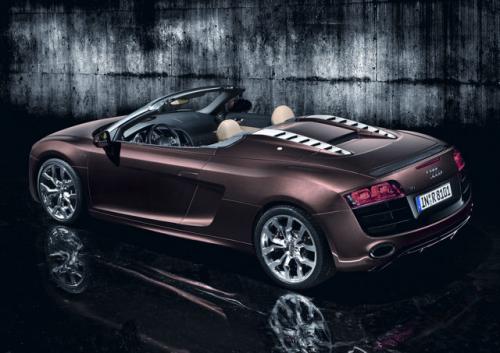 R8 Spyder 5.2 FSI quattro w odróżnieniu od coupe nie ma bocznych osłon wlotów powietrza. Elementy boczne zostały wykonane z kompozytu węglowego, podobnie jak duża pokrywa nad komorą składanego dachu.