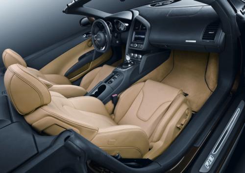 We wnętrz Audi R8 Spyder znajdziemy m.in.: skórzaną tapicerkę, wielofunkcyjną trójramienną kierownicę sportową, nisko zamontowane i regulowane elektrycznie podgrzewane fotele, aluminiowe nakładki na pedały oraz automatyczna klimatyzację. Nabywca będzie miał do wyboru sześć kolorów wnętrza.